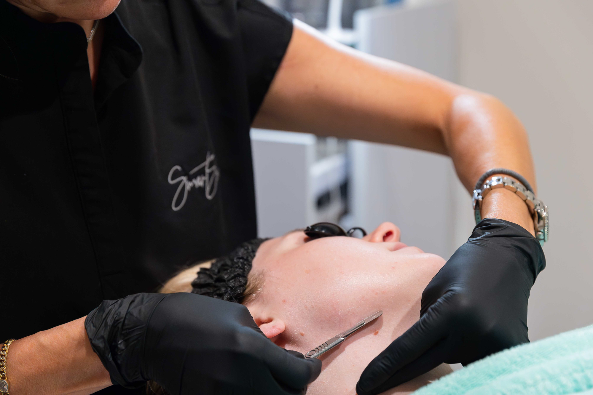 - Dermaplaning: Dermaplaning is a manual exfoliation technique that gently removes dull, dry skin cells and surface buildup. Your provider slowly glides a sterile, surgical-grade blade across your skin, sweeping away dead cells and peach fuzz. This technique helps light reflect more smoothly off your skin, yielding a glass-like glow.